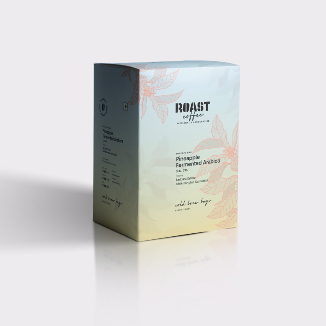 Discover the vibrant flavors of Pineapple Fermented Arabica in form of cold brew bags, showcasing fruity notes, brown sugar hints, moderate acidity, and a well-rounded mouthfeel. This medium-dark roast comes from high-altitude farms, perfect for your cold brew experience.